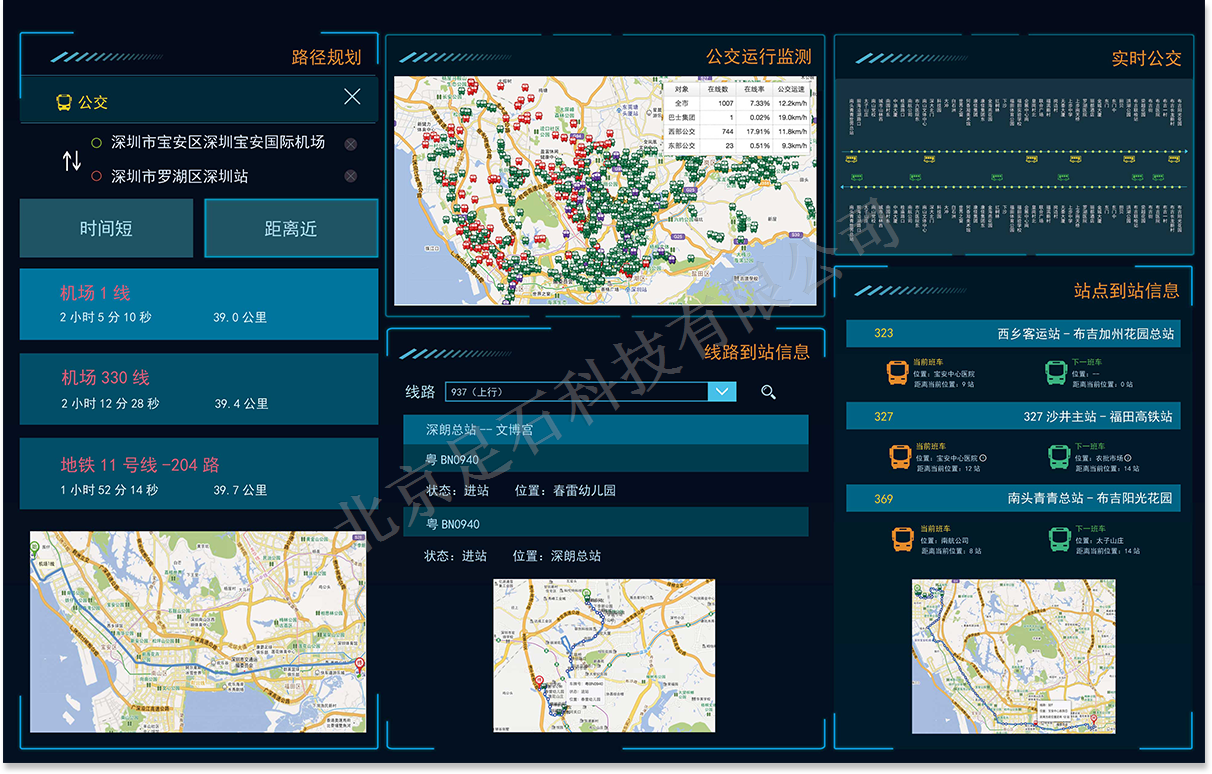 通過對公交實時運行數據和歷史數據統計分析,展示站點客流、線路客流、線網客流、出行特征等指標,展示公交實時運行信息,展示網絡評估、營運評估、異動監測結果,提供客流預測和報警功能,同時實現各類公交實時運行信息在互聯網、手機、交通綜合信息顯示屏(電子站牌)等媒介的實時發布,實現多種公交運行信息和其它相關信息在運行指揮中心和各分中心的實時動態監測和展示,為監管部門及決策人員制定公交政策及管理計劃提供數據支撐,為管理人員進行公交車輛管理、調度、安全運行監控、決策提供有效地技術支持和幫助。