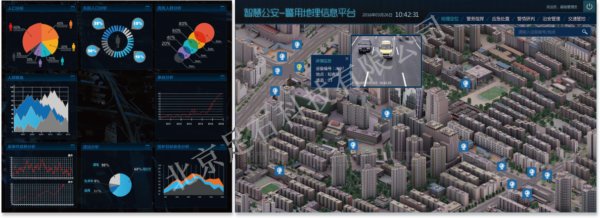 警用地理信息平臺(tái),以GIS為基礎(chǔ),整合治安管理、指揮調(diào)度、警務(wù)管理、交通管控、警情研判等于地理位置息息相關(guān)的警務(wù)工作,提供了非常直觀的圖形化顯示效果,GIS的可視化分析、研判、輔助決策等優(yōu)點(diǎn),能有效地利用警力、信息、資源等,增強(qiáng)公安部門統(tǒng)一指揮、通用協(xié)調(diào)、快速反應(yīng)、協(xié)同作戰(zhàn)及應(yīng)對(duì)各類突發(fā)事件的能力,極大地提高了公安部門的工作效率。