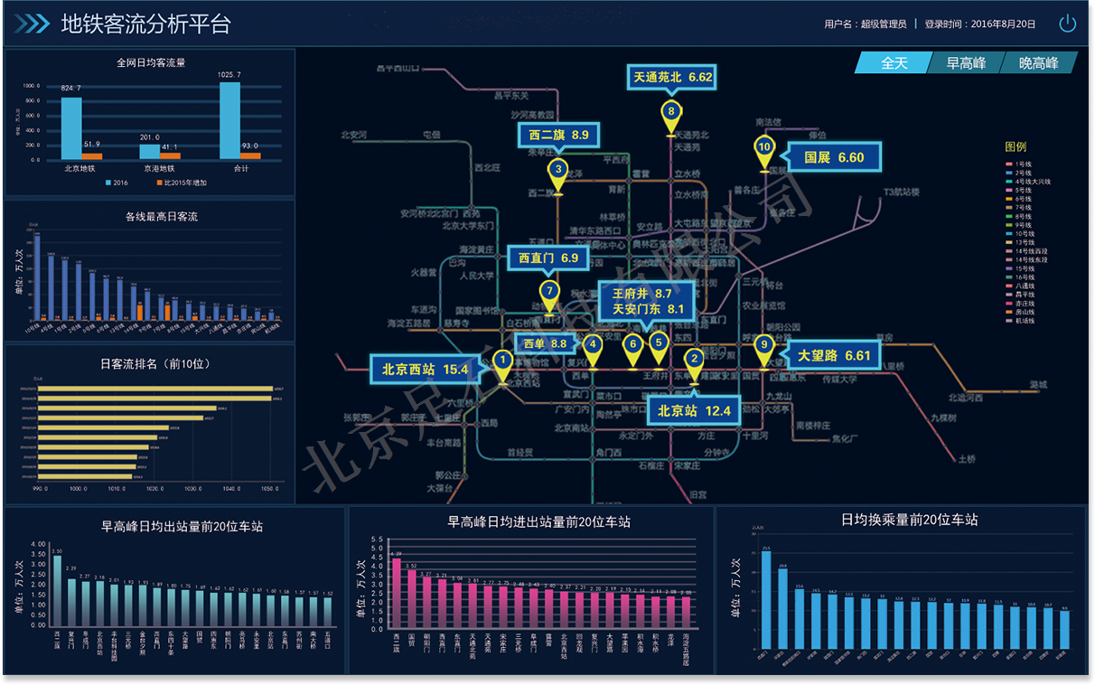 通過(guò)對(duì)地鐵實(shí)時(shí)運(yùn)行數(shù)據(jù)和歷史數(shù)據(jù)統(tǒng)計(jì)分析,展示線網(wǎng)指標(biāo)、車站指標(biāo)、客流指標(biāo)、運(yùn)行指標(biāo)、服務(wù)指標(biāo)、收入指標(biāo)等指標(biāo),展示地鐵實(shí)時(shí)運(yùn)行信息,提供客流預(yù)測(cè)和報(bào)警功能,為管理人員進(jìn)行指揮調(diào)度、安全運(yùn)行監(jiān)控、決策提供有效地技術(shù)支持和幫助。
